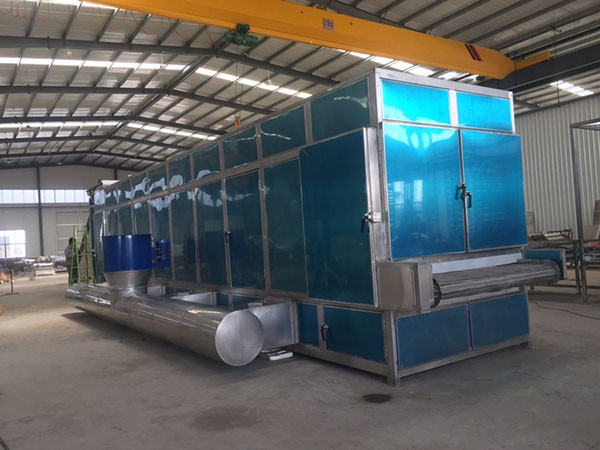 5、在設(shè)備最前端設(shè)有引風(fēng)機(jī),內(nèi)部設(shè)有循環(huán)風(fēng)道,使設(shè)備中的蒸汽組成循環(huán)風(fēng)蒸汽,節(jié)約熱量,濕氣自下而上被抽出。從而使菌類(lèi)的受溫均勻,保持同一個(gè)色澤。