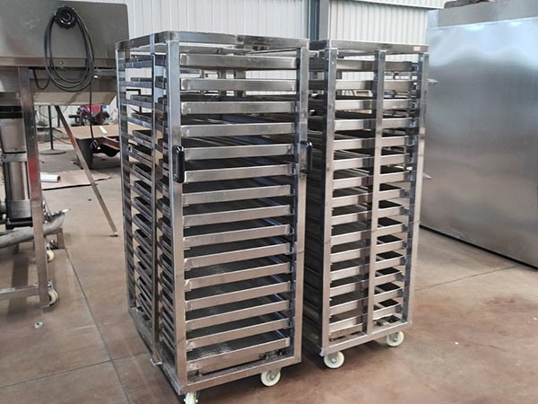 二、蒸箱有料車3個  每個18層   共擺放108個盤子盤子尺寸0.4*0.6m蒸箱底部有蒸汽氣管 。 頂部安全閥  雙層中間加保溫層   電氣箱內有溫控控制裝置保證蒸箱內溫度,溫度達到要求可關閉蒸汽。溫度低于要求自動開啟。蒸汽內有時間控制裝置,達到現定時間自動蜂鳴報警。